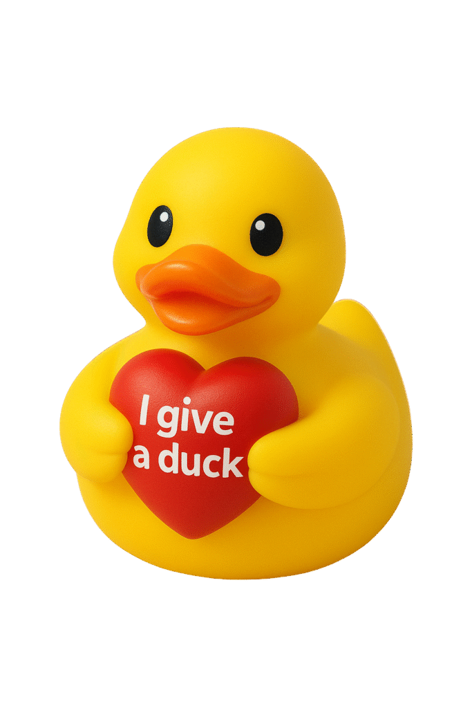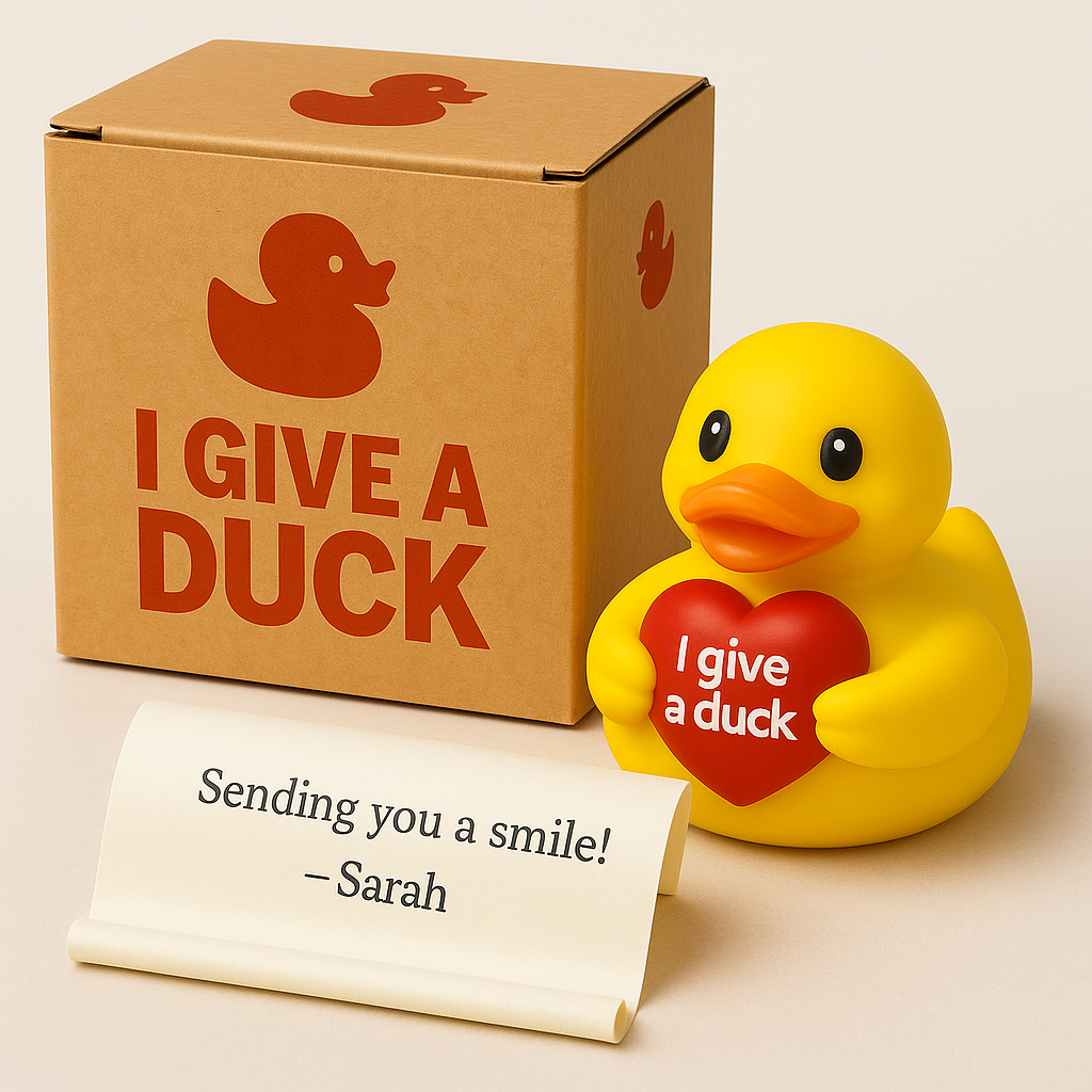 Give-A-Duck is a simple idea with a heartfelt purpose — to spread smiles, kindness, and connection through something small, cheerful, and full of character: a rubber duck. Each duck carries a message — from luck and love to encouragement and joy — reminding us that even the smallest gesture can brighten someone’s day. Whether you gift one to a friend, keep it on your desk, or start your own collection, every duck you give (or get) shares a moment of happiness and a reminder that someone, somewhere, really does “give a duck.”